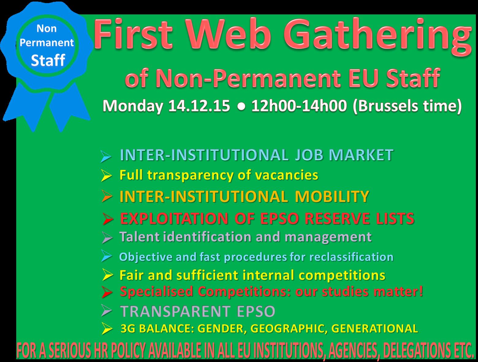 Collectif des Contractuels has the great pleasure to salute and welcome the launching of a new and independent initiative, designed to support the extremely heavy social dialogue on the Contract Agents File. The founders of this new initiative are all contract agents. All categories of staff are welcome to participate. The new initiative is willing to attract, in an unprecedented way, the collective intelligence of staff working in ALL European institutions and entities, to improve the working conditions and career perspectives of all non-permanent staff as well as setting up support actions for staff ending their careers in the EU institutions and being left in vulnerable situations, far away from their original countries. The Forum is open to all categories of staff interested in this fundamental debate on Job Security and Life Long Career Perspective. A first Web Gathering of Non-Permanent Staff will take place on 14 December – details below. First Web Gathering of Non-Permanent EU staffMonday, 14.12.15, 12-14h (Brussels time)Who is invited?We expect participants from all over the world, non-permanent staff (Contract Agents , Temporary Agents, Seconded National Experts, Interimaires etc) working for the Commission in Brussels and in EU Delegations/Representations, in Executive and Regulatory Agencies, in the European Parliament, the Council, the JRC, Joint Undertakings etc Who is inviting?A newly formed group of non-permanent staff eager to get in contact with you and to establish a new platform for exchange, mutual support and mobilisation independent of other actors. What will be discussed?Speakers from all different groups of non-permanent staff will explain their main concerns. Afterwards, we will discuss our short-term and long-term social demands, means of communication and collaboration, mobility and internal job market, mobilisation and lobbying (detailed agenda below). How can I join the gathering?You simply follow this link: (event closed) You need a headset with microphone if you would like to speak. Please try out the link at least 10 minutes before the meeting as logging in takes time. How can I speak?We are looking for speakers representing all major groups of non-permanent staff, including different Function Groups, types of work contracts and places. If you would like to speak, please send an email to (event closed).